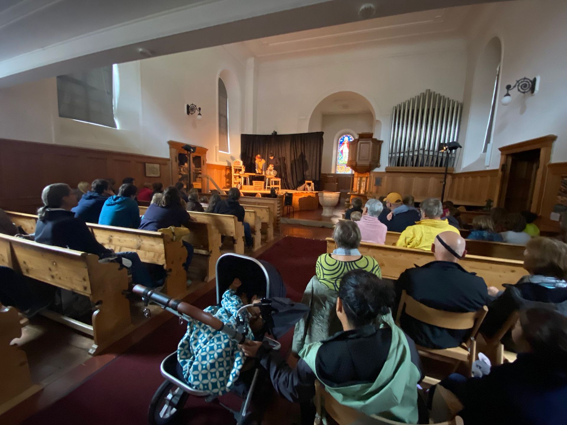 Die Kinder konnten sich über eine Kutschfahrt mit dem Rössli-Taxi freuen. Das Figurentheater Winterthur führte in der Kirche eine kleine, feine Geschichte aus dem Theaterkoffer vor "Als die Steine noch Vögel waren". Anschliessend konnte auf der Hüpfburg getobt werden.