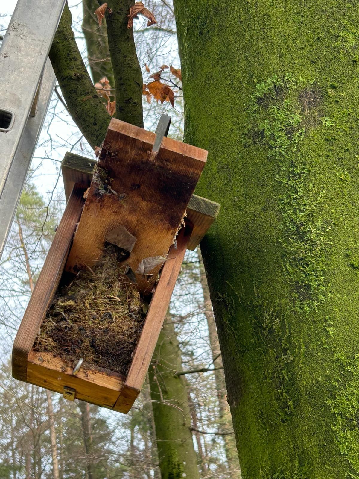 Nicht jeder Nistkasten wird von Vögeln aufgesucht, manchmal findet man auch Spuren von Siebenschläfern oder Mäusen, die es sich dort bequem gemacht haben, aber auch verlassene Hornissennester. Leider sind auch manches Mal unausgebrütete Eier oder gar ein toter Vogel darunter. Auch ein toter Siebenschläfer wurde dieses Jahr gefunden. Die verlassenen Nester werden beseitigt, die Nistkästen frisch beschriftet und kaputte Exemplare ersetzt.